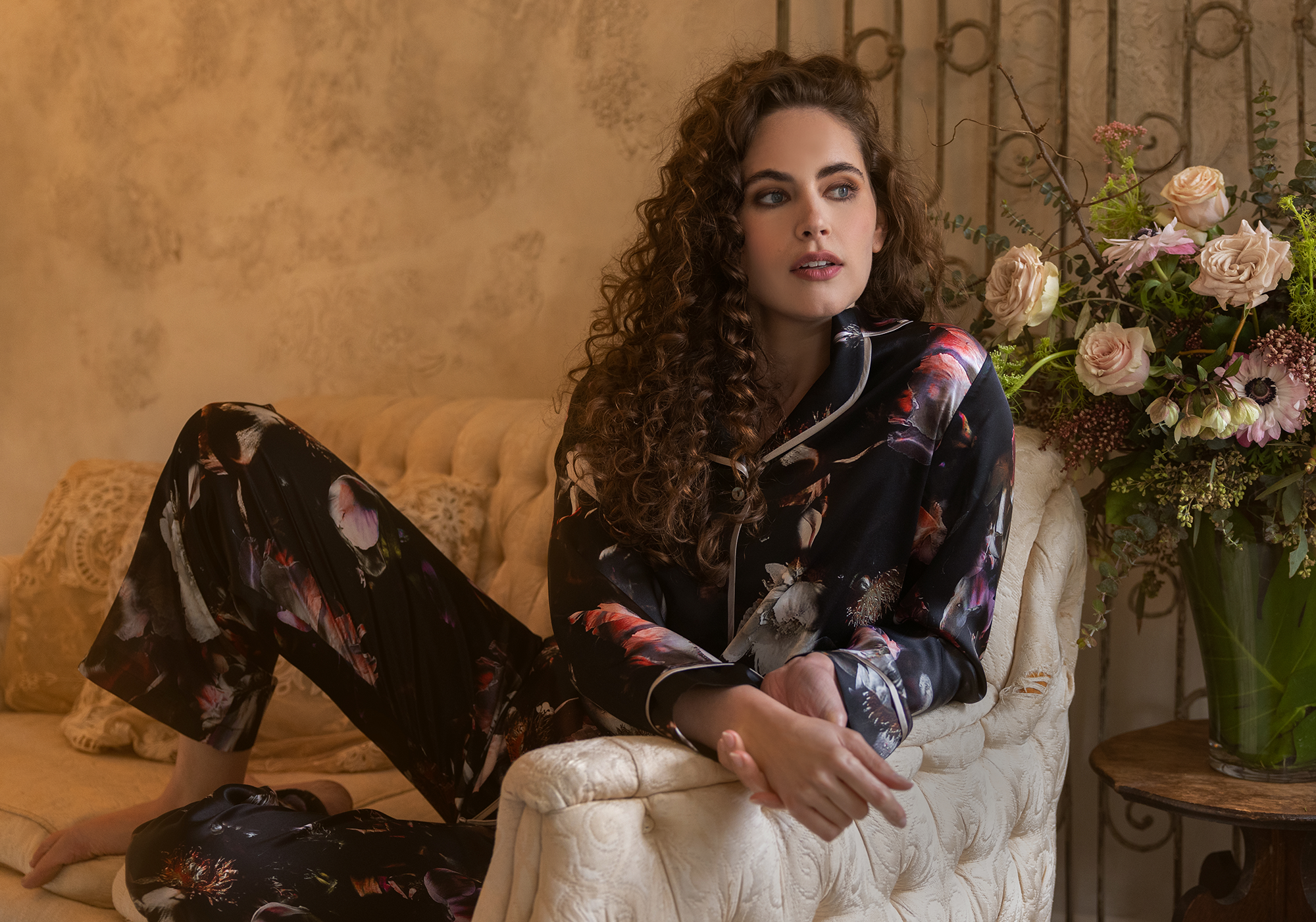 Indulge in luxury with the Moonlight Silk Print Pajamas in a midst of roses.